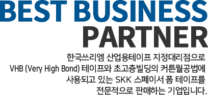 COMPANY한국씨엔테크는 늘 초심을 잃지않고 고객과 함께 성장하고 발전합니다. PRODUCTS한국씨엔테크 제품을 상세히 설명해 드립니다. COMMUNITY한국씨엔테크는 언제나 여러분과 함께하는 밝은 내일의 기업입니다. KOREA CHEMICAL 회사내부전경 (주)한국씨엔테크한국쓰리엠 산업용테이프 지정대리점으로 VHB (Very High Bond) 테이프와 초고층빌딩의 커튼월공법에 사용되고 있는 SKK 스페이서 폼 테이프를 전문적으로 판매하는 기업입니다. CONTACT US TEL 031-450-2677~8 E-mail hkcnt@naver.com FAX 031-450-2679 주소 경기 안양시 동안구 학의로 282 201호